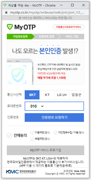 아이디와 비밀번호 찾기를 하던 도중 이런창이 뜨면 무심코 입력하게 된다. 그리고 MyOPT서비스 유료가입 버튼을 누르는 순간 유료결제 1,100원이 결제되었다고 문자가 1통온다. 당황하지 말고 아래의 방법대로 하면 myotp 서비스를 손쉽게 해지할 수 있습니다.