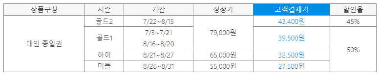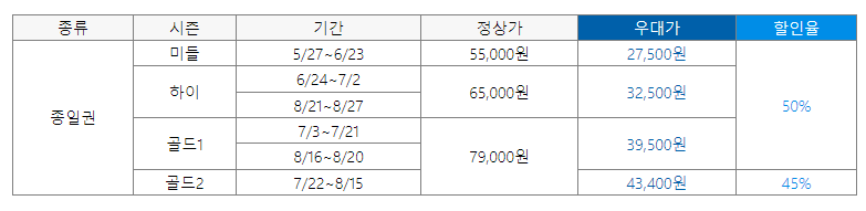 를 방문하시면 입장료가 반값으로 제공됩니다. 국민카드로 대인 종일권 골드1 시즌 티켓을 구매하시면 39,500원으로 50% 할인 혜택을 받으실 수 있습니다. 또한, 골드2 시즌 티켓은 43,400원으로 45% 할인된 금액으로 예매하실 수 있습니다. 할인 혜택은 현장 구매와 스마트 예약 구매 모두 가능하며, 할인 기간은 5월 27일부터 8월 27일까지입니다. 국민카드(신용/체크/법인/가족 포함)로 구매하시면 할인 혜택을 받을 수 있으며, 선불/충전/기프트카드는 제외됩니다.