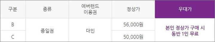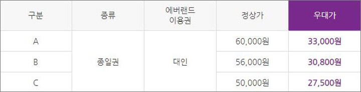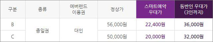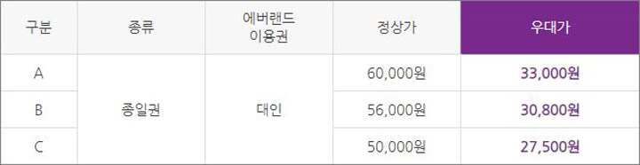 사전에 구매하면 현장에서 할인 카드에 대한 고민을 하지 않아도 되며, 주말과 연휴 같은 성수기 기간인 A 구간에 많이 오실 것을 권하고 있습니다. 이용할 때 할인된 가격으로 자유이용권을 사용할 수 있습니다.