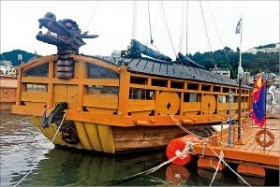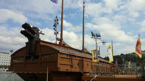 - 현재 강구안에는 3척의 거북선과 1척의 판옥선이 앞 바다에 정박되어 있습니다. 판옥선은 전투를 위해 만든 배로, 거북선과 기본적인 모양새는 비슷하지만 외형적으로는 용머리와 등판 덮개를 추가하여 공격 능력을 보다 높이는 배입니다.